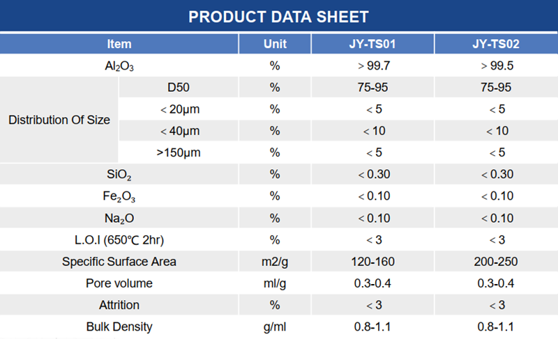 JY-TS dehydrogenation catalyst carrier has the characteristics of low abrasion, and concentrated particle size distribution. The size distribution, pore volume, specific surface area and other indicators of the product can be adjusted according to requirements. It usually uses for fluidized bed.