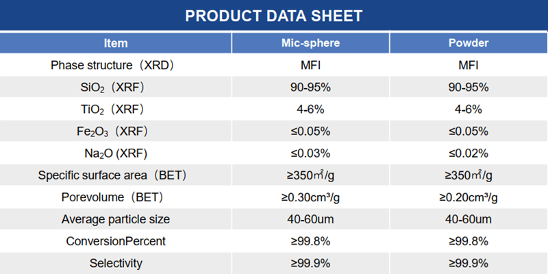 Titanium silicon molecular sieves are formed by Ti atoms partially replacing aluminum atoms in silica-aluminum molecular sieves, belonging to the ZSM-5 series zeolite molecular sieves, with MFI topological structure. The primary structural units, such as silica-oxygen tetrahedrons and titanic-oxygen tetrahedrons, are connected by oxygen Bridges to form the secondary structural units of five-membered rings, and further form a three-dimensional microporous skeleton. MFI molecular sieve has a two-dimensional pore structure, the 10-membered ring parallel to the A-axis is S-shaped, with a pore size of 0.51nm×0.55nm, and the 10-membered ring parallel to the B-axis is linear, with a pore size of 0.54nm×0.56nm.The average particle size of titanium silicon molecular sieves produced by the company is 50-60m, the minimum is close to 10m, the maximum is less than 105m, and the particle size distribution is uniform.